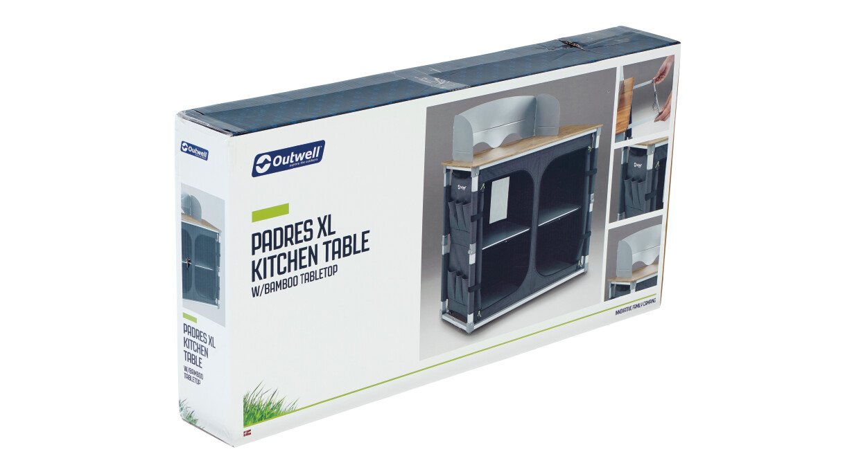 Damit wird das Kochen beim Campen viel komortabler. Auf einer angenehmen Stehhöhe, bietet dieser schicke Küchentisch von Outwell eine massive Bambustischplatte. Ein Windschutz verhindert, dass beim Kochen die Flammen des Brenners ausgehen. Darunter befindet sich ein geräumiger Schrank aus schickem schwarz-grauem Polyester-Stoff, der Innenraum ist in vier Staufächer unterteilt.